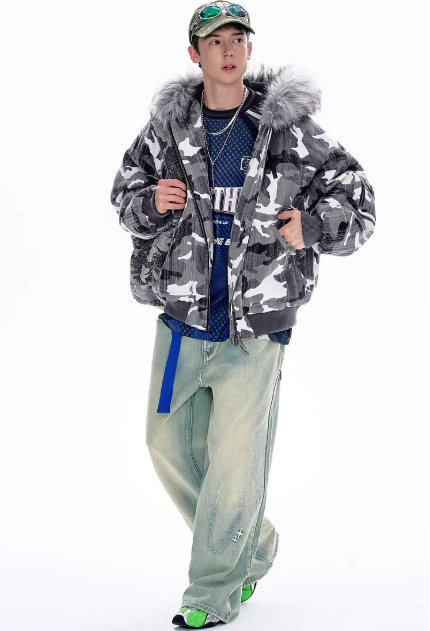 Description: Warm winter parka with camo design and soft fur lining. Durable cotton blend with reinforced stitching, perfect for urban and outdoor streetwear.